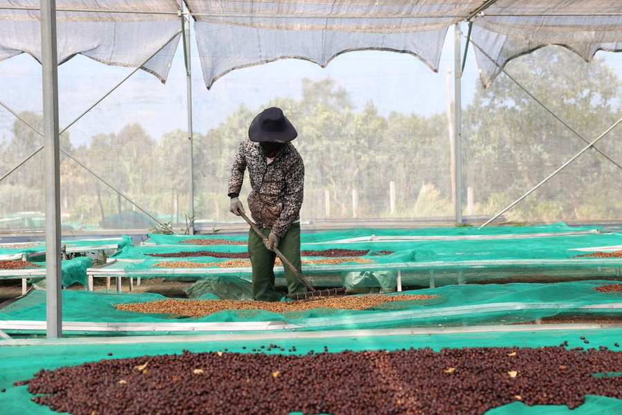 | Cà phê đặc sản được phơi trong nhà lưới theo quy trình nghiêm ngặt tại trang trại Aeroco Coffee để đảm bảo chất lượng. Ảnh: Tuấn Anh/TTXVN |