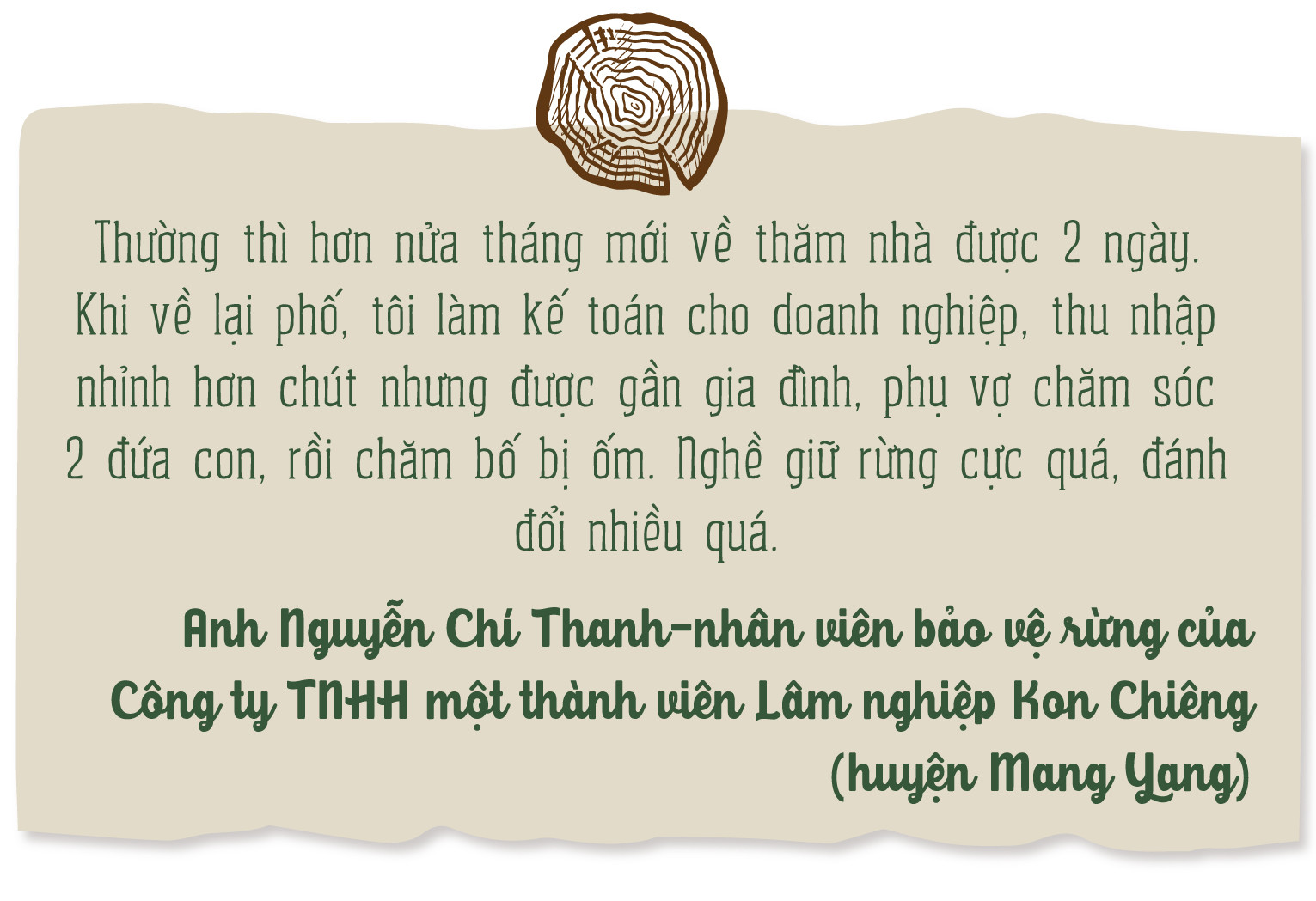Anh Nguyễn Chí Thanh (TP. Pleiku) có gần 8 năm gắn bó với nghề giữ rừng. Thế nhưng, nỗi lo cơm áo gạo tiền cùng những tháng ngày chênh vênh trên chiếc võng mắc giữa rừng, hết lo muỗi, vắt thì lại thấp thỏm nỗi sợ lâm tặc rình rập trong bóng tối, anh Thanh cũng đành nghỉ việc. Anh chia sẻ: Giữa năm 2012, anh đến nhận công tác tại Công ty TNHH một thành viên Lâm nghiệp Kon Chiêng (huyện Mang Yang), cách nhà hơn 60 km. Công việc vất vả nhưng thu nhập thì chưa đến 5 triệu đồng/tháng. Trừ tiền xăng xe, chi tiêu ăn uống, chưa tháng nào anh dành được quá 2 triệu đồng để phụ vợ nuôi con.