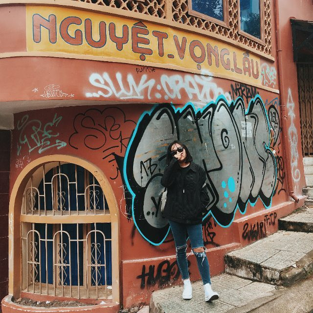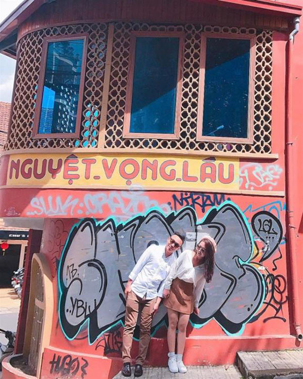 Ngôi nhà mang kiến trúc Á Đông xưa, được sơn màu đỏ với khung cửa sổ màu vàng nhạt, những dòng chữ graffiti đẹp mắt khiến những bức hình thêm ảo diệu.