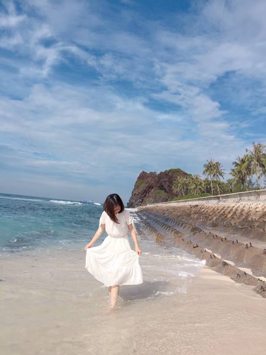 Khi đến đảo bạn đừng quên chuẩn bị thêm một bộ đồ bơi để có thể ngâm mình vào làn nước trong vắt và xanh biếc nhé. Như cô bạn của mình, thích sự yên tĩnh mộc mạc nhưng khá mạo hiểm khi chọn một bãi tắm thật vắng để tung tăng chơi đùa với biển xanh.