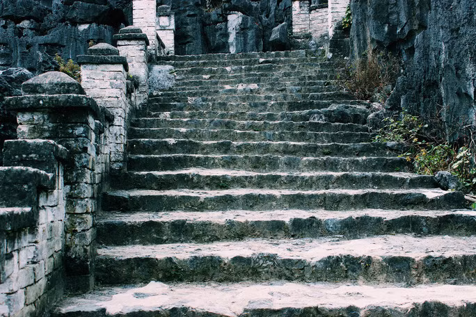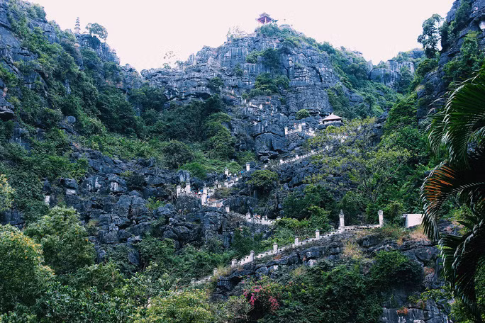 | Ngay khi bước vào cổng khu du lịch hang Múa, con đường bậc thang đá trắng phau dẫn tới đỉnh núi đã hiện rõ. |