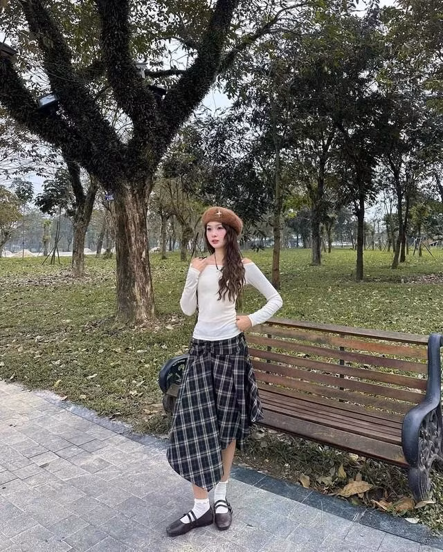 Áo thun trắng trễ vai phối cùng quần ống rộng màu nâu, be hoặc chân váy midi xám nhạt sẽ mang đến vẻ ngoài thanh lịch, phù hợp cho cả công sở lẫn những buổi hẹn cuối tuần. Để tăng phần cuốn hút, bạn có thể thêm phụ kiện như túi xách da màu nâu camel hoặc giày loafer đen bóng. Điểm mạnh của bản phối này nằm ở sự cân bằng, màu trắng mang lại sự tươi sáng, trong khi sắc trung tính giúp tổng thể không bị quá phô trương.