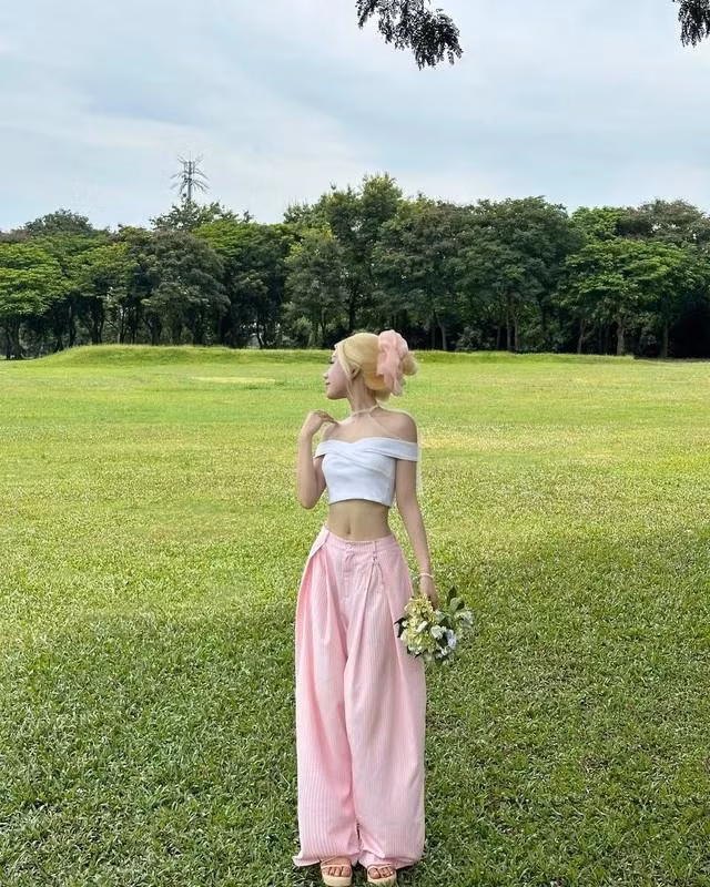 Một chiếc áo crop top hay áo trễ vai trắng phối cùng quần ống suông hồng hoặc chân váy pastel sẽ tạo nên vẻ ngoài vừa trẻ trung vừa thời thượng. Để tăng chiều sâu cho trang phục, hãy chọn phụ kiện ánh kim như khuyên tai vàng hoặc xăng đan ánh bạc, tạo điểm nhấn mà không làm mất đi sự nhẹ nhàng. Phong cách này đặc biệt phù hợp với các buổi dạo phố hay sự kiện ngoài trời, nơi bạn muốn tỏa sáng với vẻ đẹp thanh thoát và hiện đại.