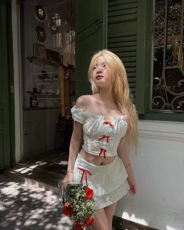 Để tránh sự đơn điệu, hãy chú ý đến những thiết kế độc đáo như một chiếc áo crop top có thiết kế nơ màu đỏ nổi bật hay hình họa tiết ngộ nghĩnh để tăng thêm phần thu hút cho trang phục. Phụ kiện như kính mát gọng trong suốt, túi tote da trắng hoặc trang sức ngọc trai sẽ nâng tầm bản phối, tạo nên sự hoàn mỹ. Phong cách này đặc biệt phù hợp với các sự kiện thời trang hoặc những buổi chụp ảnh ngoài trời, nơi ánh sáng mùa hè làm nổi bật vẻ đẹp tinh khôi của sắc trắng.