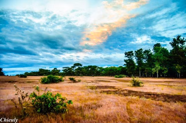| Nhìn từ xa, cỏ hồng chuyển thành màu tím dưới rừng tràm vào lúc hoàng hôn . |
