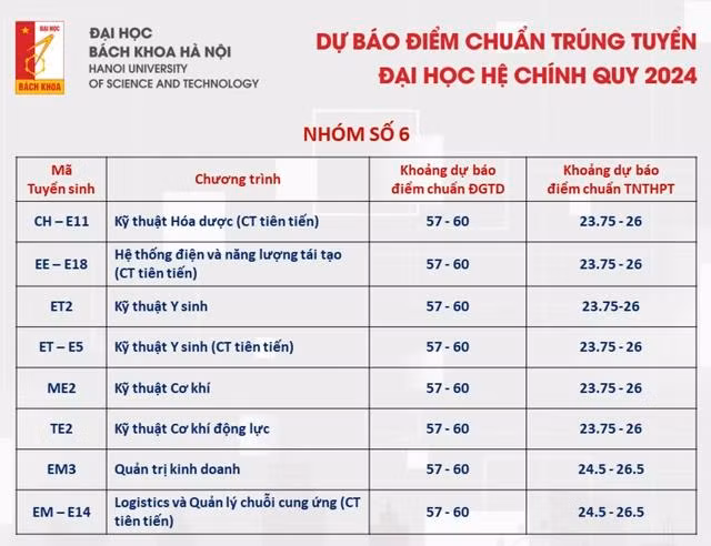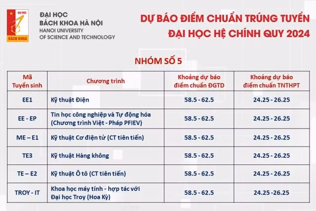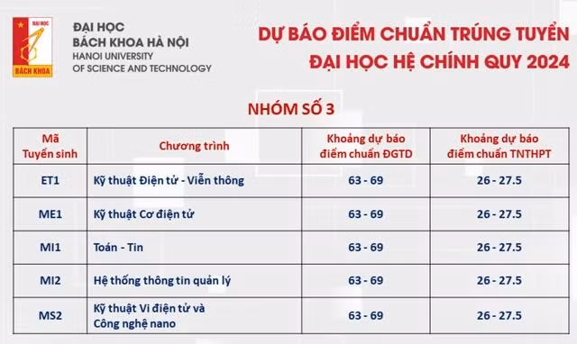 Căn cứ vào các phổ điểm thi tốt nghiệp THPT 2024 và kỳ thi đánh giá tư duy TSA, cũng như căn cứ vào xu hướng đăng ký nguyện vọng của thí sinh, Ban Tuyển sinh - Hướng nghiệp của ĐH Bách khoa Hà Nội đã dựng lên một phác thảo dự báo điểm chuẩn cho 64 chương trình đào tạo của ĐH Bách khoa Hà Nội.