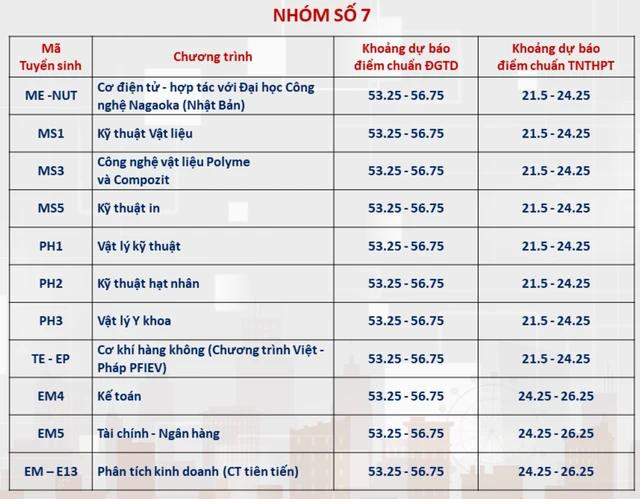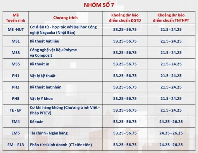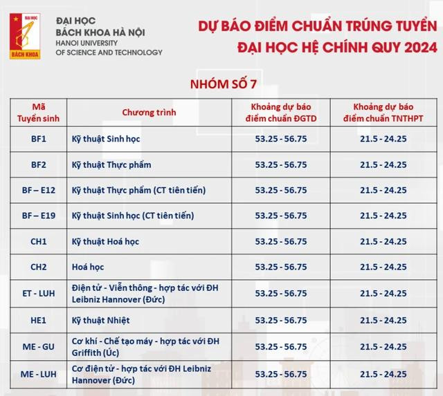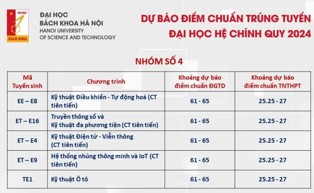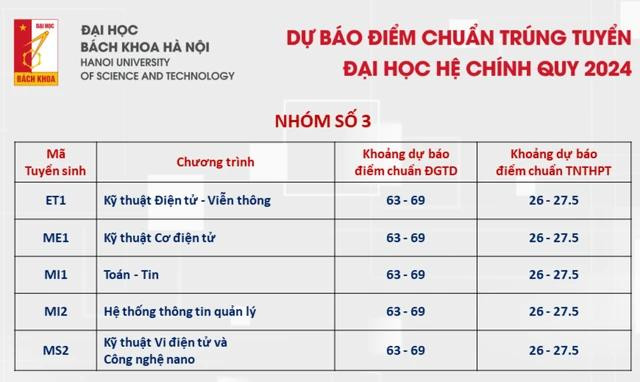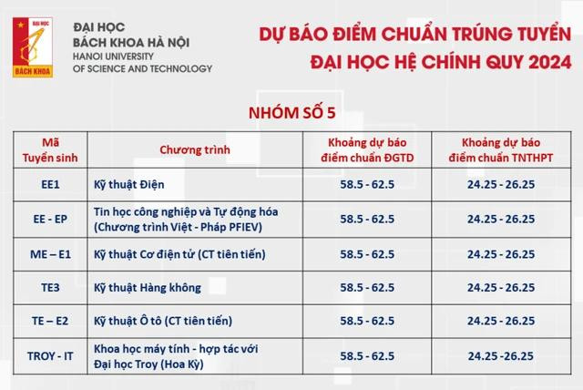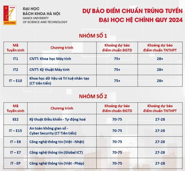 Nhóm ngành được dự báo sẽ có điểm chuẩn dự báo cao nhất thuộc về lĩnh vực công nghệ thông tin với ngành: khoa học máy tính (IT1), kỹ thuật máy tính (IT2), khoa học dữ liệu và trí tuệ nhân tạo (IT-E10). Từ nhiều năm gần đây, điểm chuẩn dự báo của nhóm ngành này luôn nằm trong top cao nhất của ĐH Bách khoa Hà Nội.