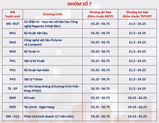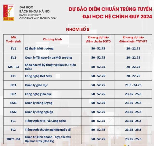 Nhóm ngành được dự báo điểm chuẩn thấp nhất nằm trong khoảng 20 - 22,75 điểm, là các ngành kỹ thuật môi trường (EV1), quản lý tài nguyên và môi trường (EV2), CTTT khoa học và kỹ thuật vật liệu (MS-E3), công nghệ dệt may (TX1). Mức dự báo năm 2024 của các ngành này có sự tăng nhẹ so với mức dự báo năm 2023 là 0,75 điểm.