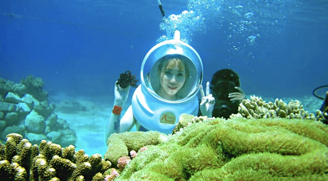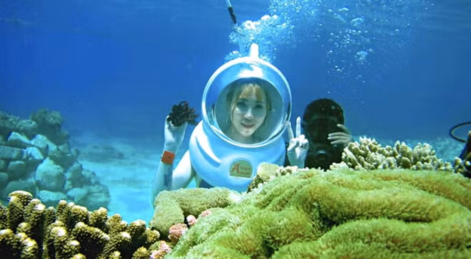 Một dịch vụ nổi tiếng và được nhiều du khách chọn lựa là trải nghiệm làm “Phi hành gia dưới đại dương” của Công ty VietAsian Nha Trang. Sau khi đội chiếc mũ lặn khiến người ta liên tưởng đến nhà du hành vũ trụ, bạn sẽ bước xuống đại dương và... đi bộ ngắm cảnh. Qua lớp kính của chiếc mũ, du khách có thể nhìn thấy từng rạn san hô trước mặt, từng đàn cá bơi lội quanh mình và hệ sinh thái biển đầy màu sắc.