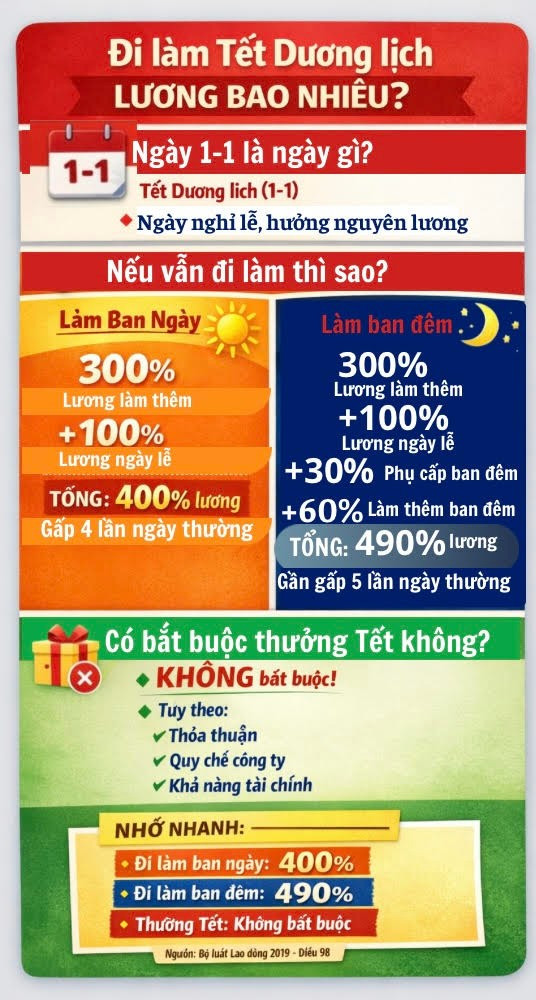 Theo quy định của Bộ luật Lao động 2019, Tết Dương lịch (ngày 1-1) là ngày nghỉ lễ và người lao động được nghỉ làm, hưởng nguyên lương. Tuy nhiên, do đặc thù sản xuất – kinh doanh, nhiều doanh nghiệp vẫn bố trí người lao động đi làm trong dịp này. Với những trường hợp làm việc, mức thu nhập được hưởng cao hơn đáng kể so với ngày thường.