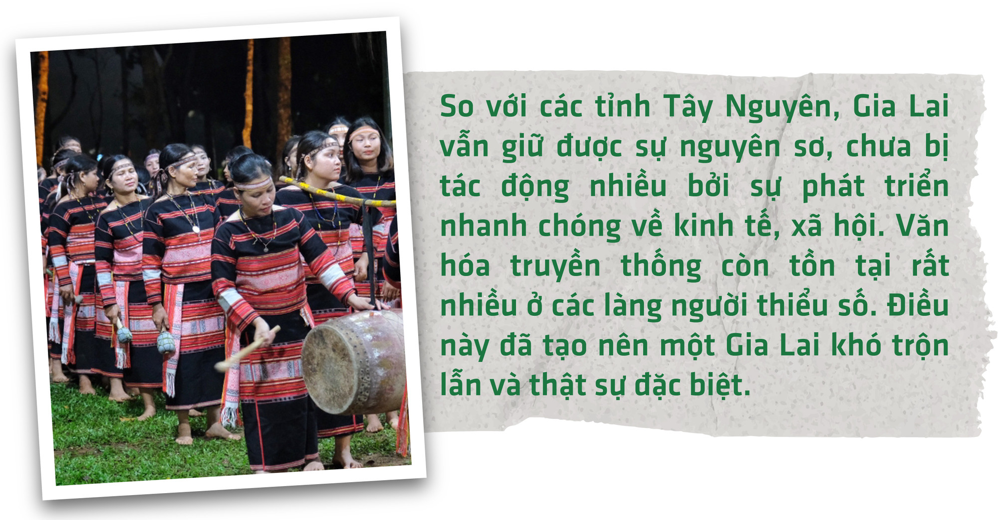 Bên cạnh lợi thế nổi bật về tự nhiên, văn hóa của hai dân tộc thiểu số chiếm số đông tại Gia Lai là Jrai và Bahnar thực sự độc đáo, thể hiện rõ nét qua phong tục, tập quán, kiến trúc, lễ hội, âm nhạc, điêu khắc, văn học dân gian, ẩm thực, trang phục. Không gian văn hóa cồng chiêng-Di sản văn hóa phi vật thể đại diện của nhân loại được UNESCO công nhận, kết hợp cùng chuỗi di tích lịch sử và các địa điểm tâm linh tôn giáo đặc sắc đã tạo nên những thế mạnh riêng có để Gia Lai phát triển các loại hình: du lịch sinh thái, nghỉ dưỡng, du lịch văn hóa-lịch sử và du lịch cộng đồng hấp dẫn du khách trong và ngoài nước.