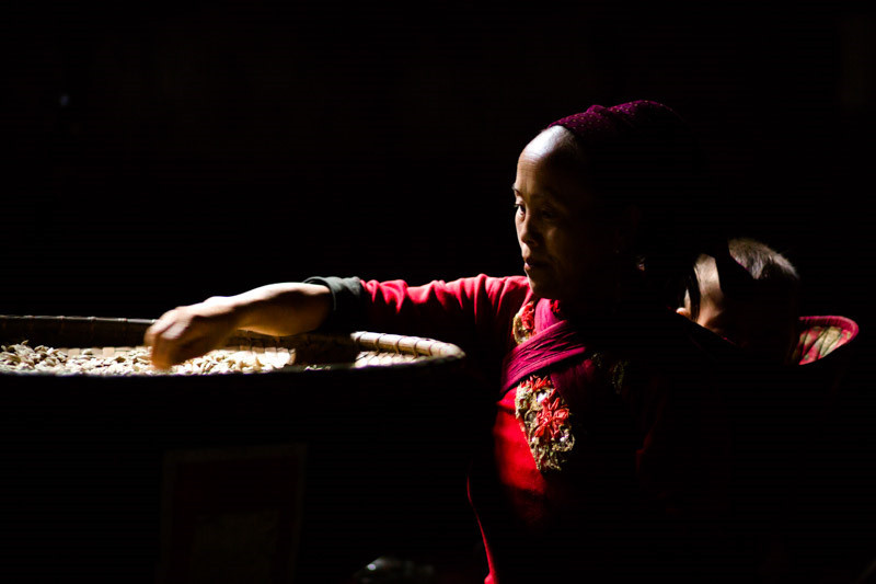"Bắc Hà", bức ảnh chụp người phụ nữ Dao đỏ vừa địu con vừa làm việc nhà.