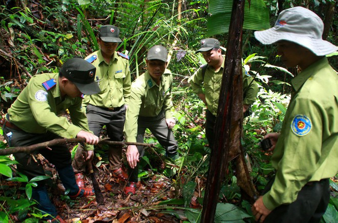 Để bảo vệ tốt môi trường sinh sống của sao la, các đội tuần tra thường xuyên “săn” bẫy thú rừng và phá bỏ. ẢNH: HOÀNG SƠN