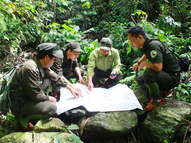 Đội tuần tra KBT sao la Thừa Thiên-Huế nghiên cứu bản đồ để vạch tuyến tuần tra