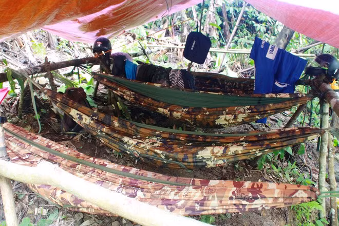 Lán trại đơn sơ của đội tuần tra bảo tồn sao la Thừa Thiên-Huế giữa rừng sâu