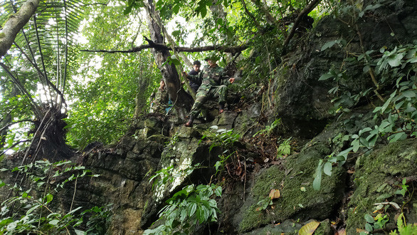 "Con đường" men theo mấy triền đá cao ngất, mọi người phải dùng tay lần nắm cho được cành hoặc rễ cây; chân thì tìm điểm tựa là mũi đá hoặc hốc đất để leo lên từng bước. Tôi nhìn xuống chân: bầy vắt cả chục con loe ngoe hút máu. Kiểm lâm Tuấn phải dùng ống thuốc xịt "giải cứu"...