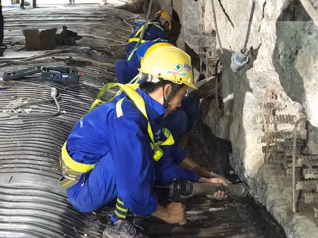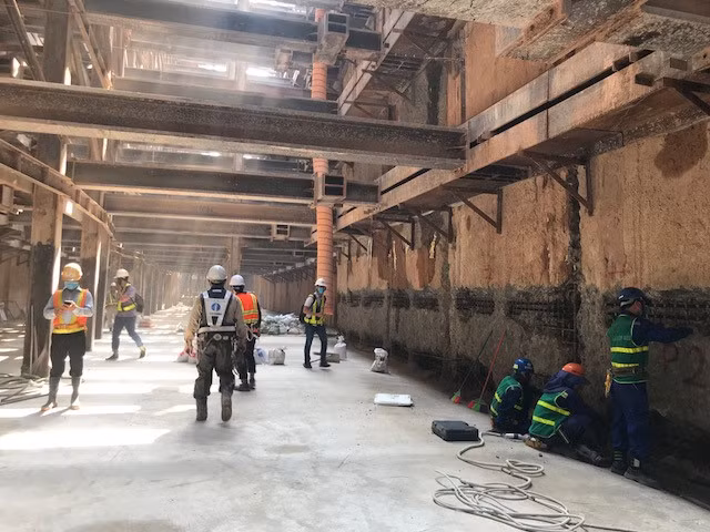 | Trong cái nắng chói chang của TP.HCM mùa khô, dưới đường hầm, các công nhân vẫn khẩn trương làm việc. |
