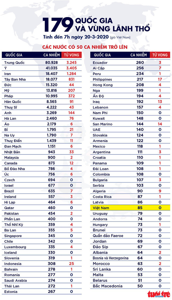 *Tunisia ghi nhận ca tử vong đầu tiên do COVID-19. Venezuela ghi nhận thêm 6 ca nhiễm, lên tổng 42 ca.