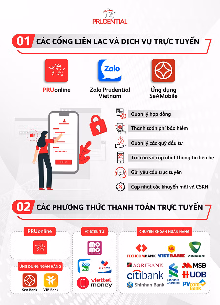 Một trong số đó là PRUOnline, trang thông tin đa chức năng cho phép hầu hết các dịch vụ bảo hiểm có thể tương tác từ xa. Hay phổ biến là ứng dụng Zalo, đây cũng trở thành một kênh liên lạc và giải quyết quyền lợi bảo hiểm hiệu quả, dễ dùng mà nhiều người lựa chọn.