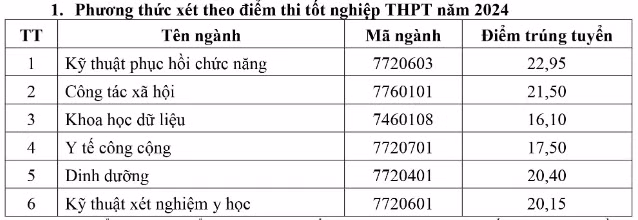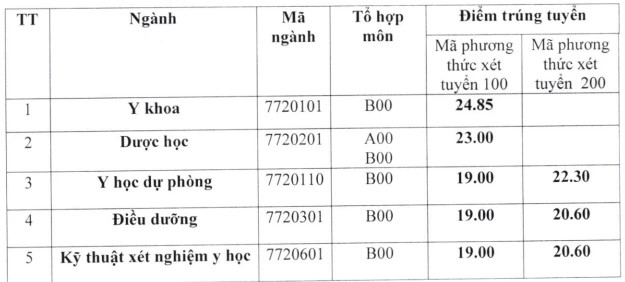 Điểm trúng tuyển phương thức 100 (dựa vào kết quả thi tốt nghiệp THPT 2024) và phương thức 200 (dựa vào điểm học bạ) của Trường ĐH Y khoa Vinh như sau:
