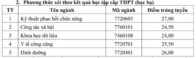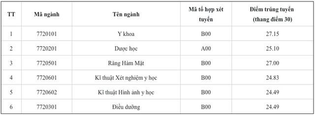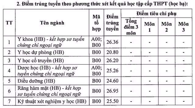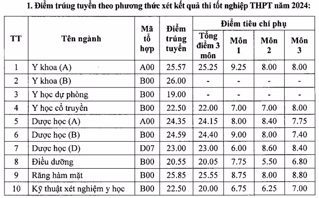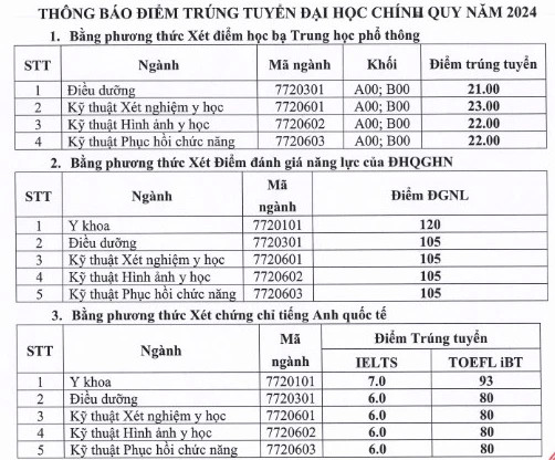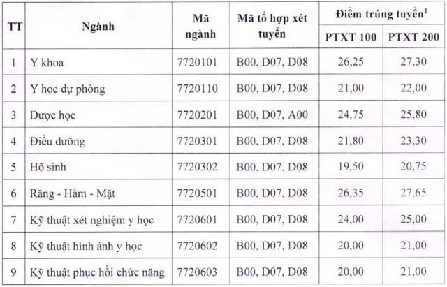 Điểm trúng tuyển phương thức 100 (dựa vào kết quả thi tốt nghiệp THPT 2024) và phương thức 200 (dựa vào điểm học bạ) của Trường ĐH Y dược Thái Nguyên như sau: