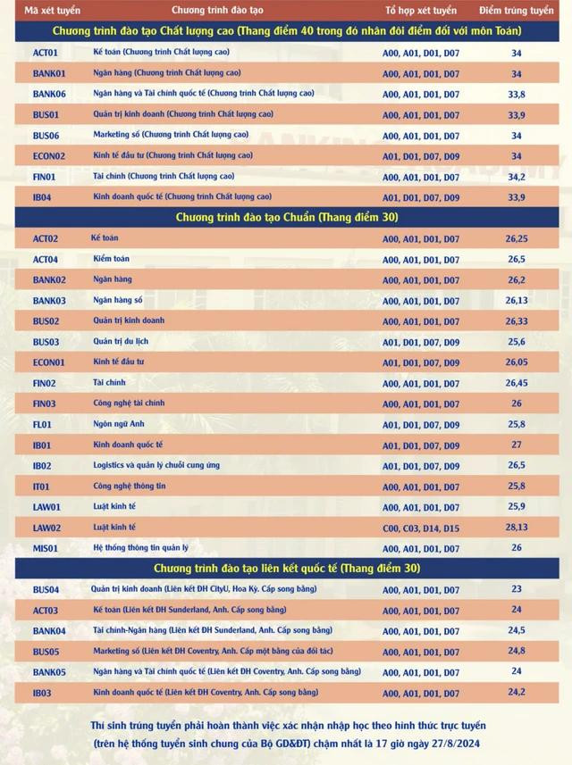 Những ngành xét thang điểm 40 (môn toán nhân hệ số 2), ngành tài chính có điểm trúng tuyển cao nhất với 34,2 điểm, trung bình thí sinh phải đạt 8,5 điểm/môn.