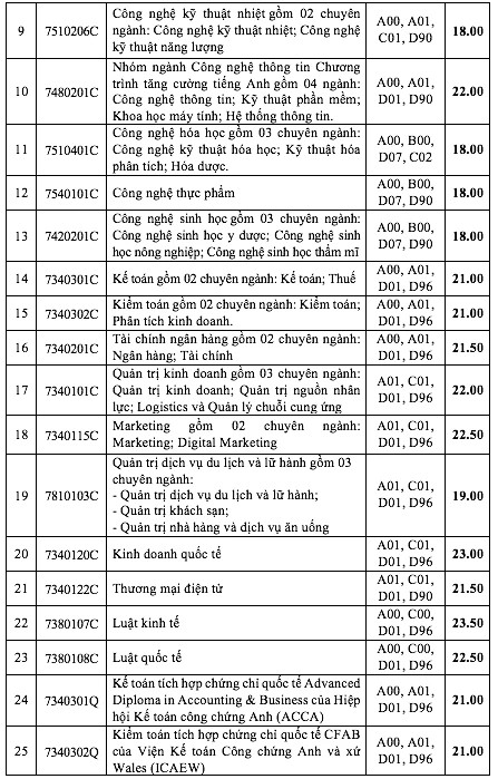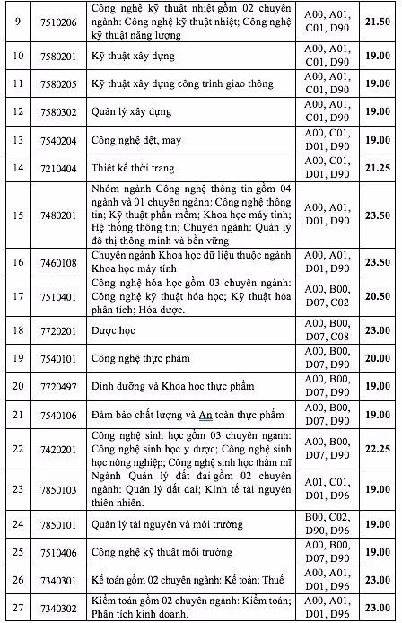 Điểm chuẩn từng ngành cụ thể như bảng sau: