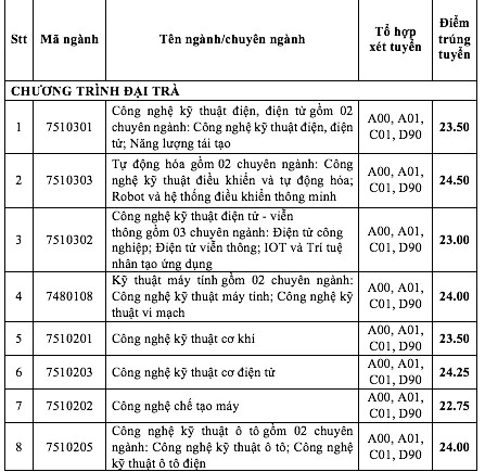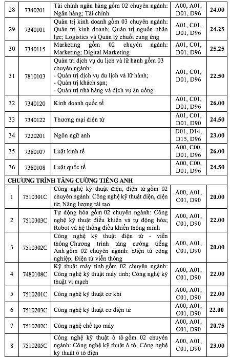 Tiến sĩ Nguyễn Trung Nhân, Trưởng phòng Đào tạo nhà trường, cho biết điểm chuẩn năm nay của trường hầu hết tăng ở cả chương trình đại trà và chương trình tăng cường tiếng Anh. Mức tăng cao nhất đến 2,5 điểm ở các ngành: công nghệ kỹ thuật điện, điện tử; công nghệ kỹ thuật nhiệt và luật quốc tế.