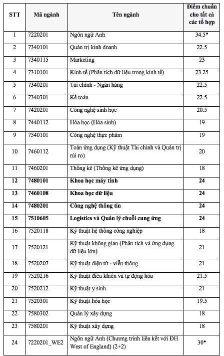 Trong 23 ngành đào tạo bậc ĐH do Trường ĐH Quốc tế cấp bằng, 4 ngành có mức điểm chuẩn cao nhất gồm: khoa học máy tính, khoa học dữ liệu, công nghệ thông tin, logistics và quản lý chuỗi cung ứng. Riêng ngành ngôn ngữ Anh có mức điểm chuẩn 34,5 điểm (tính theo thang 40 điểm, môn tiếng Anh nhân hệ số 2).