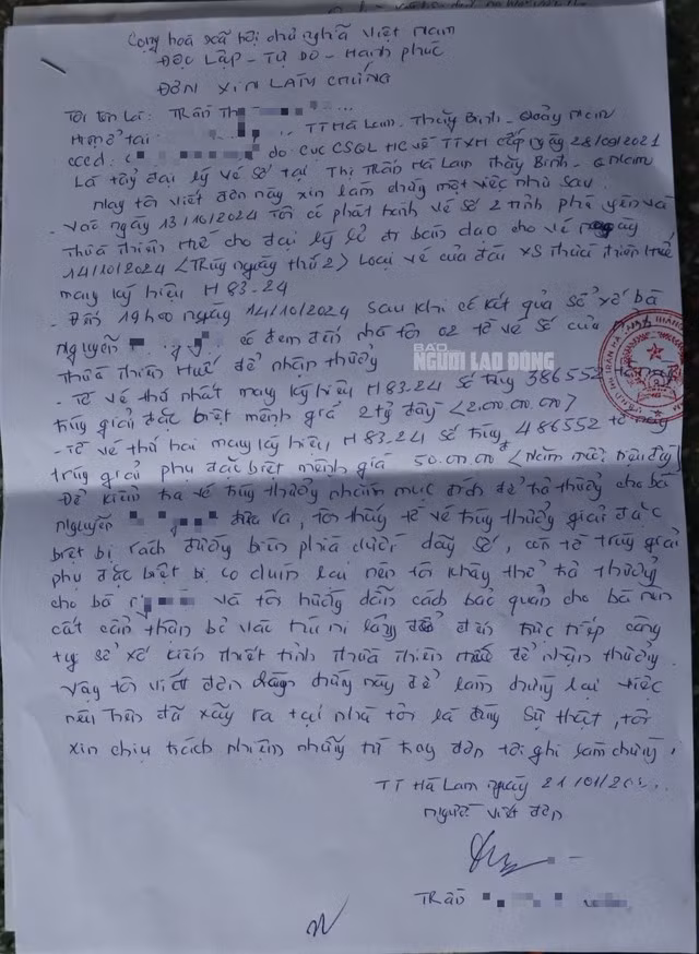 "Khi khai tại tòa, tôi kể lại sự việc là sau khi dò vé số trúng, tôi đến đại lý của bà X. để đổi thưởng thì được bà hướng dẫn bảo quản tờ vé số để đi ra công ty làm việc, đề nghị đổi thưởng. Chính vì vậy, tòa yêu cầu bà X. có đơn làm chứng việc tôi có tới đổi thưởng, đơn phải có xác nhận chữ ký của bà X. của chính quyền địa phương. Ngoài ra, tòa cũng yêu cầu có giấy xác nhận của chính quyền về việc tôi đang làm nông tại địa phương, có những thửa đất đang trồng lúa, rau màu là đúng sự thật" – bà Ng. cho biết.