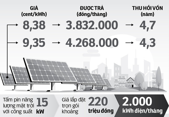 Lấy ví dụ từ các gia đình lắp đặt điện mặt trời, ông Khánh cho biết một hộ gia đình ở TP.HCM có diện tích mái nhà 100m2 có thể lắp đặt hệ thống tấm pin năng lượng mặt trời với công suất 15kW. Giá lắp đặt trọn gói hiện nay khoảng 220 triệu đồng, theo ông Khánh, với lượng bức xạ lớn ở khu vực phía Nam, trung bình mỗi tháng hệ thống này có thể sản xuất hơn 2.000kWh điện. Trước đây, với mức giá 9,35 cent/kWh phát lên lưới, người dùng sẽ được trả 4.268.000 đồng. Như vậy, khoảng 4,3 năm người dùng sẽ thu hồi vốn. Còn với mức giá 8,38 cent/kWh, người dùng thu về 3.832.000 đồng/tháng và cần khoảng 4,7 năm để thu hồi vốn, dài hơn 4 tháng so với mức giá cũ.