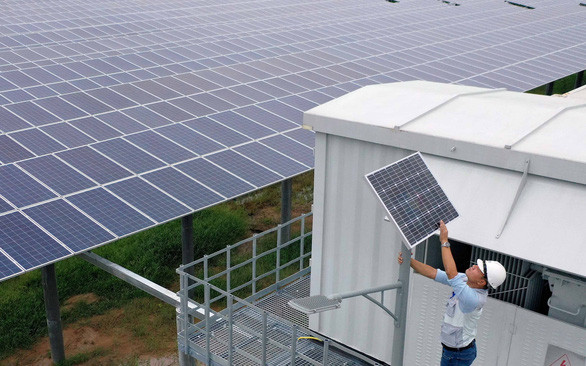 Lắp đặt pin mặt trời tại một dự án ở hồ Dầu Tiếng, Bình Dương - Ảnh: TỰ TRUNG