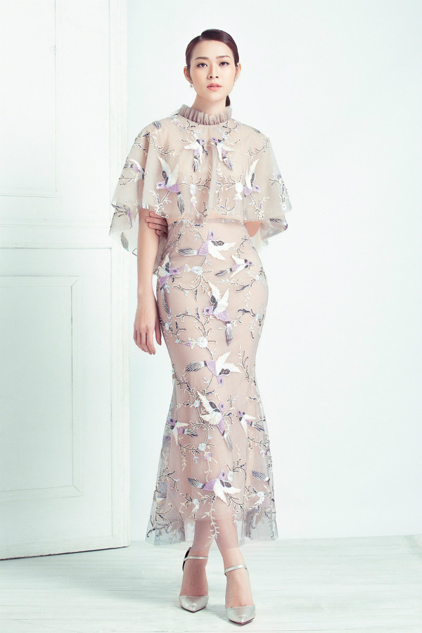 | Kỹ thuật in laser trên nền vải xuyên thấu mang đến vẻ lộng lẫy cho người mặc. Cao Thái Hà hạn chế sử dụng phụ kiện để tránh rườm rà. |