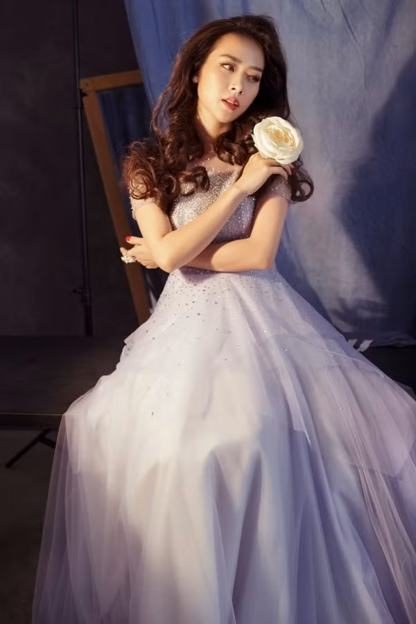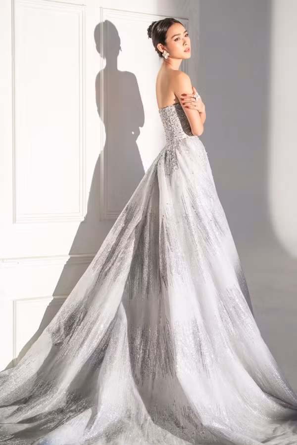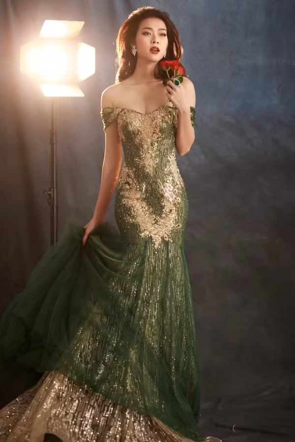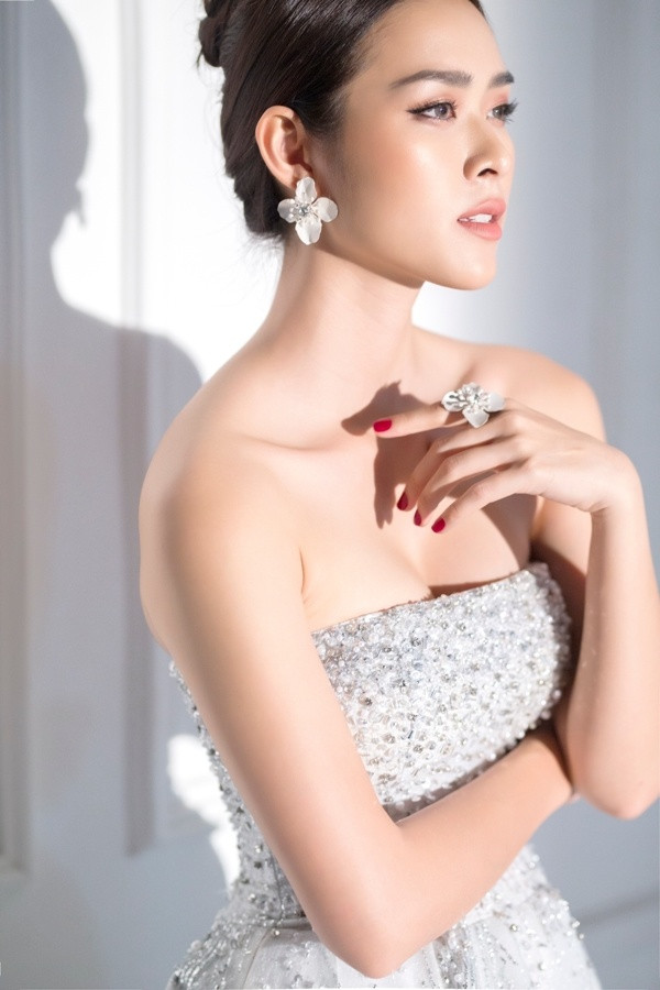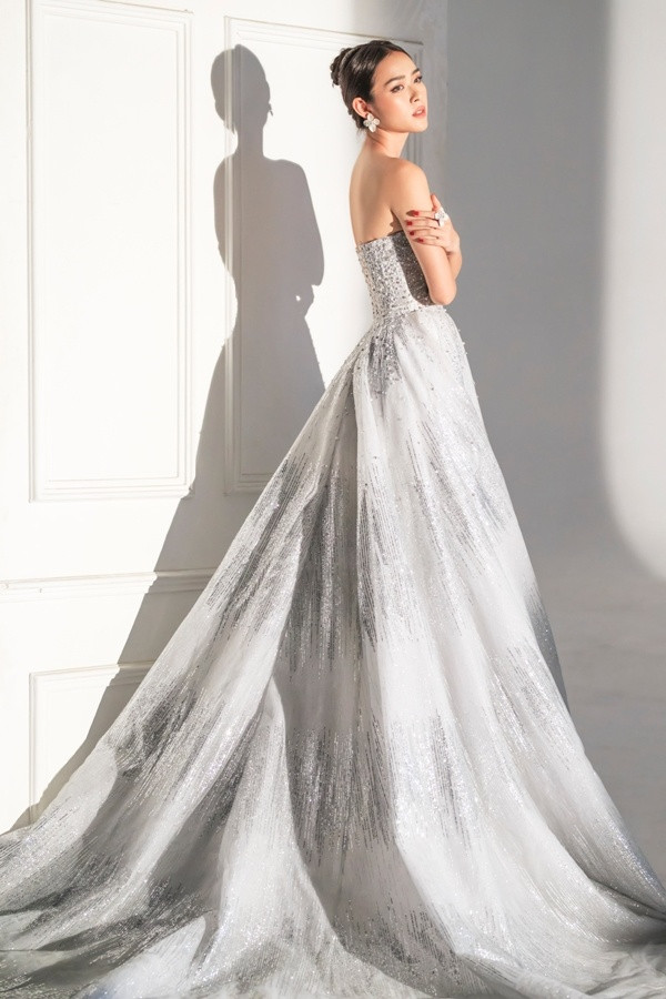 Người đẹp diện đầm đuôi cá phối voan mỏng, đính đá pha lê của nhà thiết kế Linh Nga. Cô đeo bông tai, nhẫn cùng tông màu.