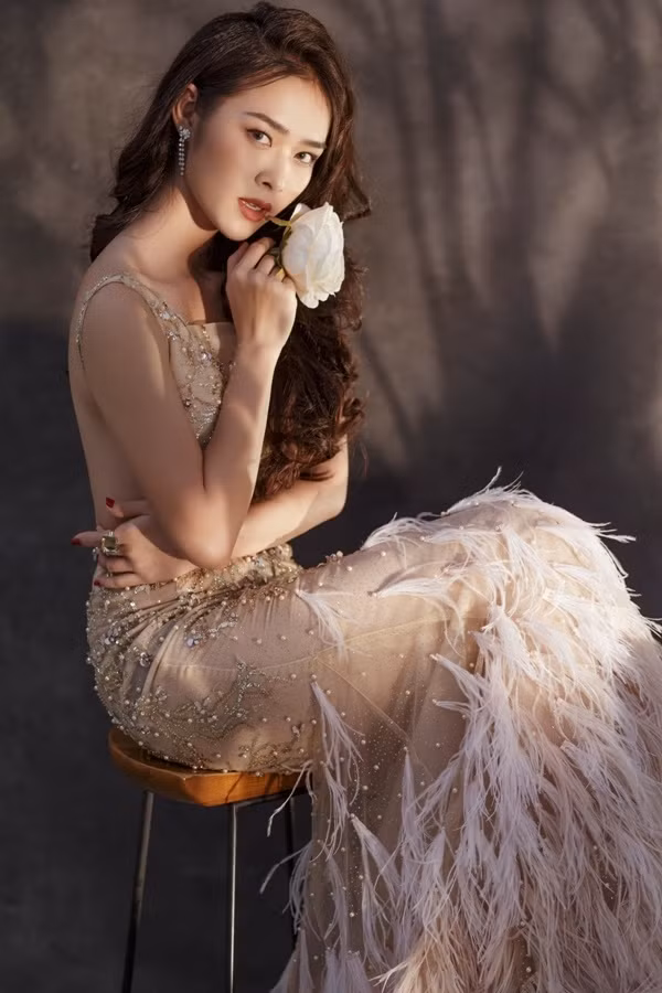 Đầm dây màu kem đính tua rua, hạt cườm giúp người mặc khoe trọn phần lưng thon. Diệp Bảo Ngọc vừa hoàn thành vai diễn trong phim "Hợp đồng mãnh thú" - chuyển thể từ kịch cùng tên.