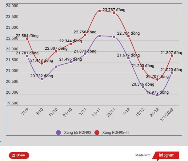 Trước đó giá xăng đã giảm 4 lần liên tiếp, trong đó lần điều chỉnh gần nhất (ngày 21/12/2022), sau khi trích lập quỹ bình ổn, xăng RONN 95-III giảm 493 đồng; xăng E5 RON92 giảm 371 đồng/lít. Ngoài ra, dầu diesel giảm 69 đồng, dầu hỏa giảm 65 đồng/lít và dầu mazút giảm 153 đồng/kg.