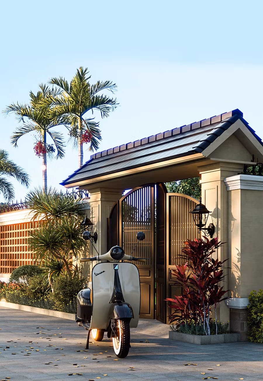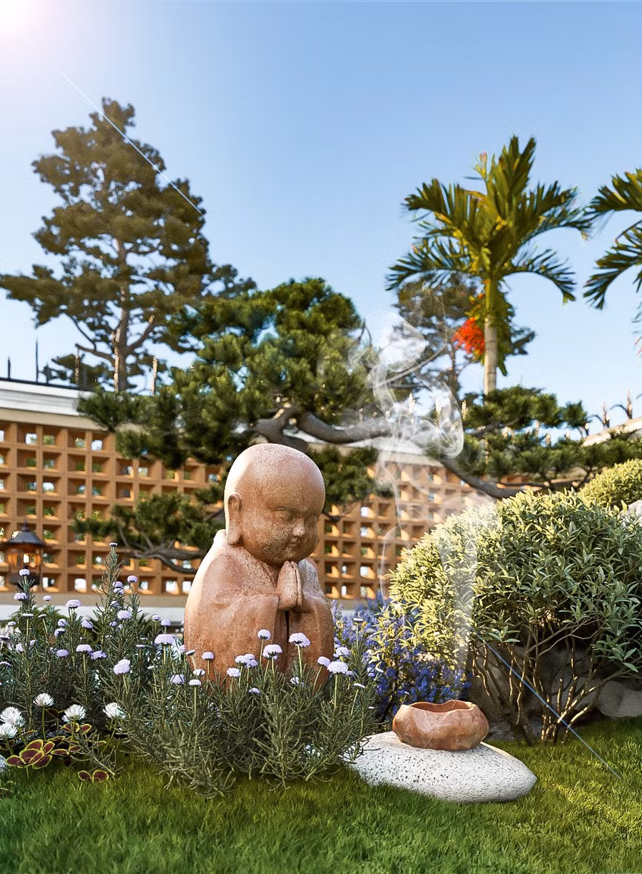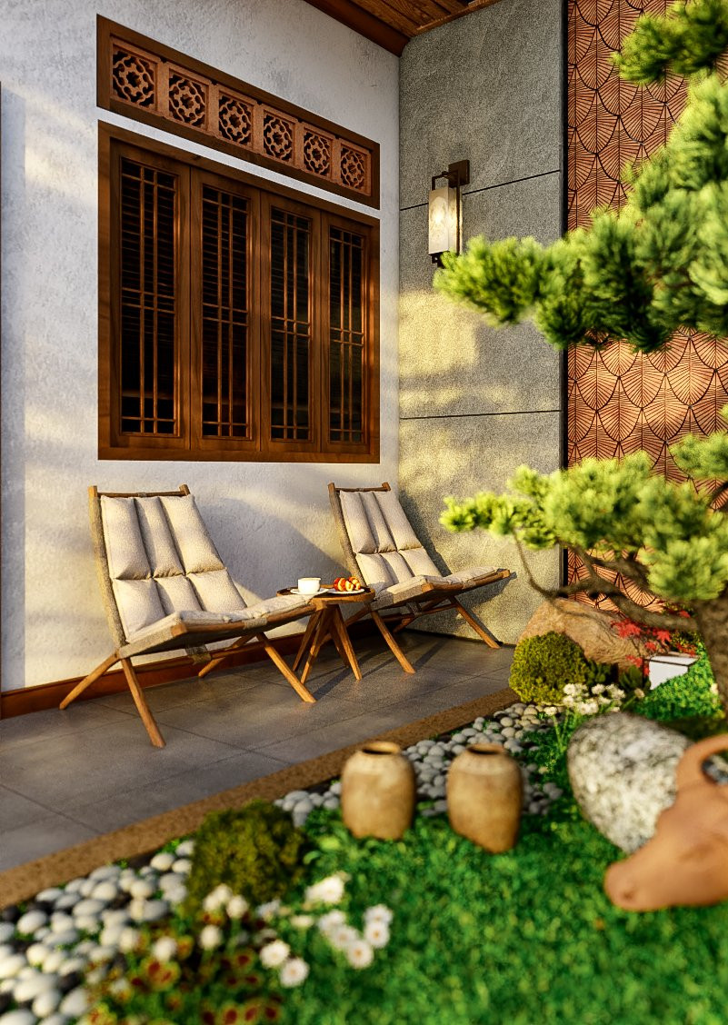 Đúng với tên gọi của ngôi nhà này, khuôn viên sân vườn được Kiến trúc sư lựa chọn gạch hoa gió màu cam đất đơn giản mà tinh tế, bao lấy một khoảng cây xanh tươi mát nằm bên hồ cá koi. Dù trong lòng phố thị vẫn sẽ tìm thấy sự thư thả bình yên mà không cần đi đâu xa cả, mọi thứ hiện hữu ngay chính trong ngôi nhà của mình.