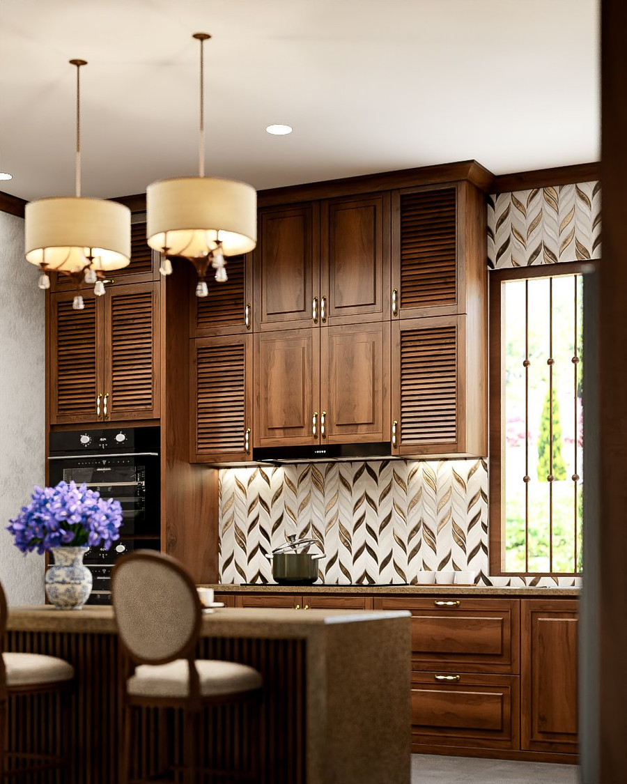| Tủ bếp được làm từ gỗ thịt màu nâu trầm liên kết với tổng thể ngôi nhà kết hợp ô cửa sổ lớn lưu thông không khí. |