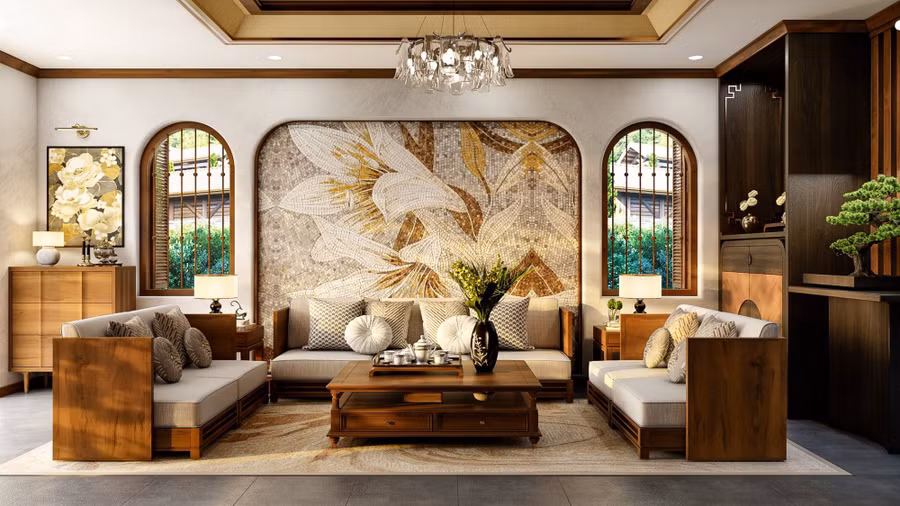 Phòng khách của ngôi nhà đẹp "Nhà Của Gió" được thiết kế từ những chất liệu quen thuộc như gỗ tone màu nâu trầm, kết hợp với gạch mosaic họa tiết nhẹ nhàng, tạo nên không gian tinh tế, sang trọng mà không thiếu sự gần gũi ấm áp.