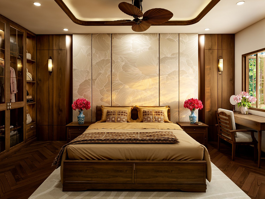 Sau ngày dài bận rộn, phòng ngủ chính là nơi quan trọng nhất mang tới sự thư giãn thông qua những giấc ngủ sâu. Các phòng ngủ trong ngôi nhà "Nhà Của Gió" được bố trí đầy đủ tiện nghi với sự phối hợp các gam màu nâu, chêm thêm ánh sáng vàng nhẹ tạo nên không gian sang trọng, tình cảm giúp gia chủ luôn an lạc và thư thái.