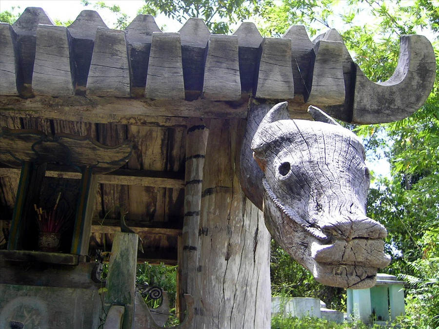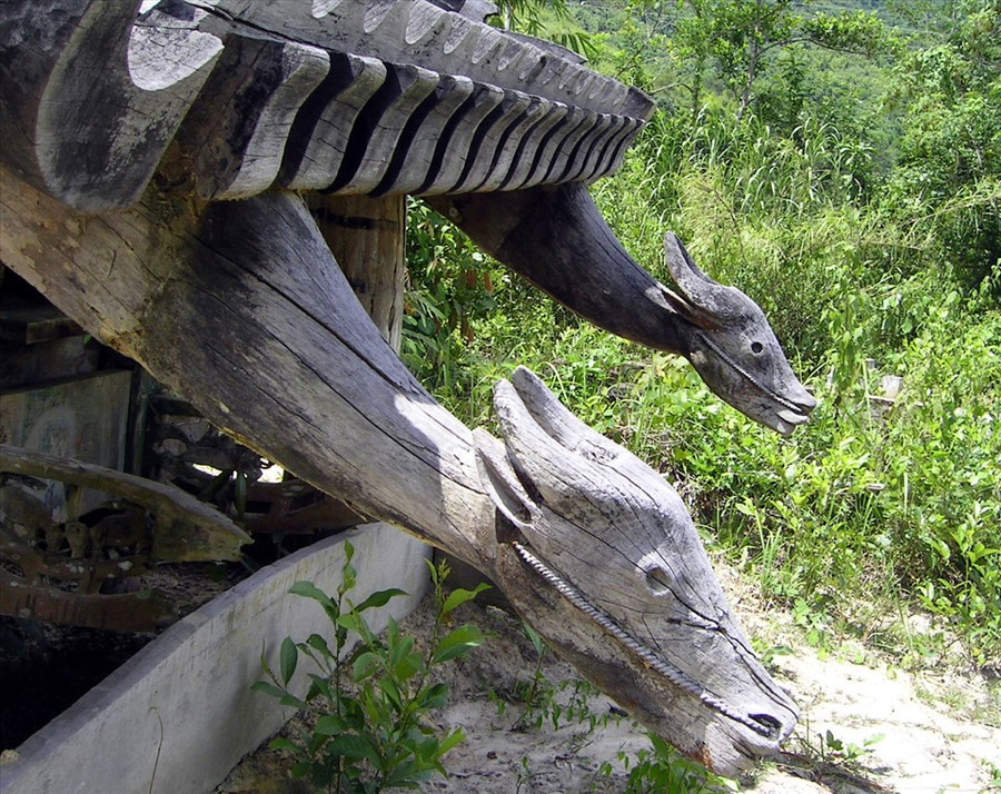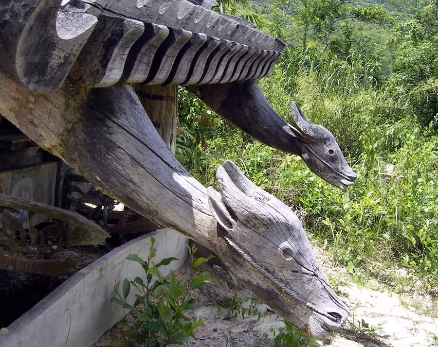 | Điêu khắc đầu trâu trên mái 1 nhà mồ Cơ Tu ở huyện Đông Giang, Quảng Nam. Ảnh: Thanh Hải |