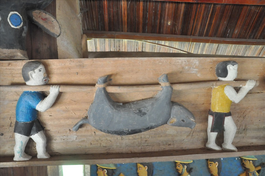 | Một mảng điêu khắc gỗ sinh động trong nhà Gươil- nhà sinh hoạt cộng đồng của người Cơ Tu ở huyện Tây Giang, Quảng Nam. Ảnh Thanh Hải |