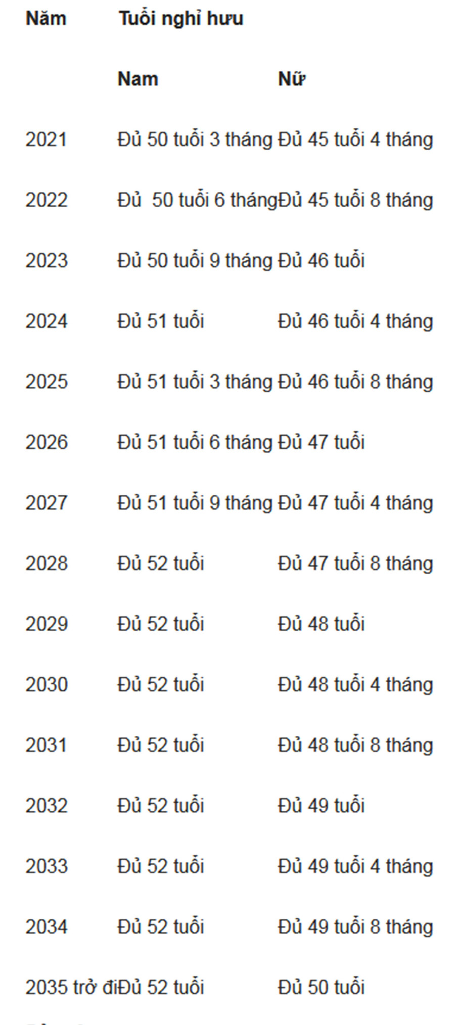 Bảng 1. Độ tuổi nghỉ hưu theo quy định tại Khoản 2 Điều 169 của Bộ luật Lao động 2019