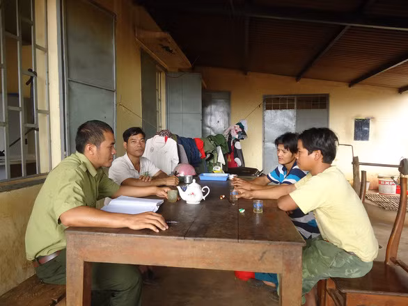 Ông Điểu Long (thứ 2 từ trái) cùng anh em kiểm lâm, cộng đồng nhận khoán bảo vệ rừng thôn Đắk Á, xã Bù Gia Mập, huyện Bù Gia Mập, tỉnh Bình Phước bàn kế hoạch đi tuần tra bảo vệ rừng - Ảnh: BÙI LIÊM