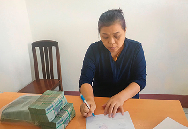 Huyền tại cơ quan công an. ẢNH CÔNG AN CUNG CẤP