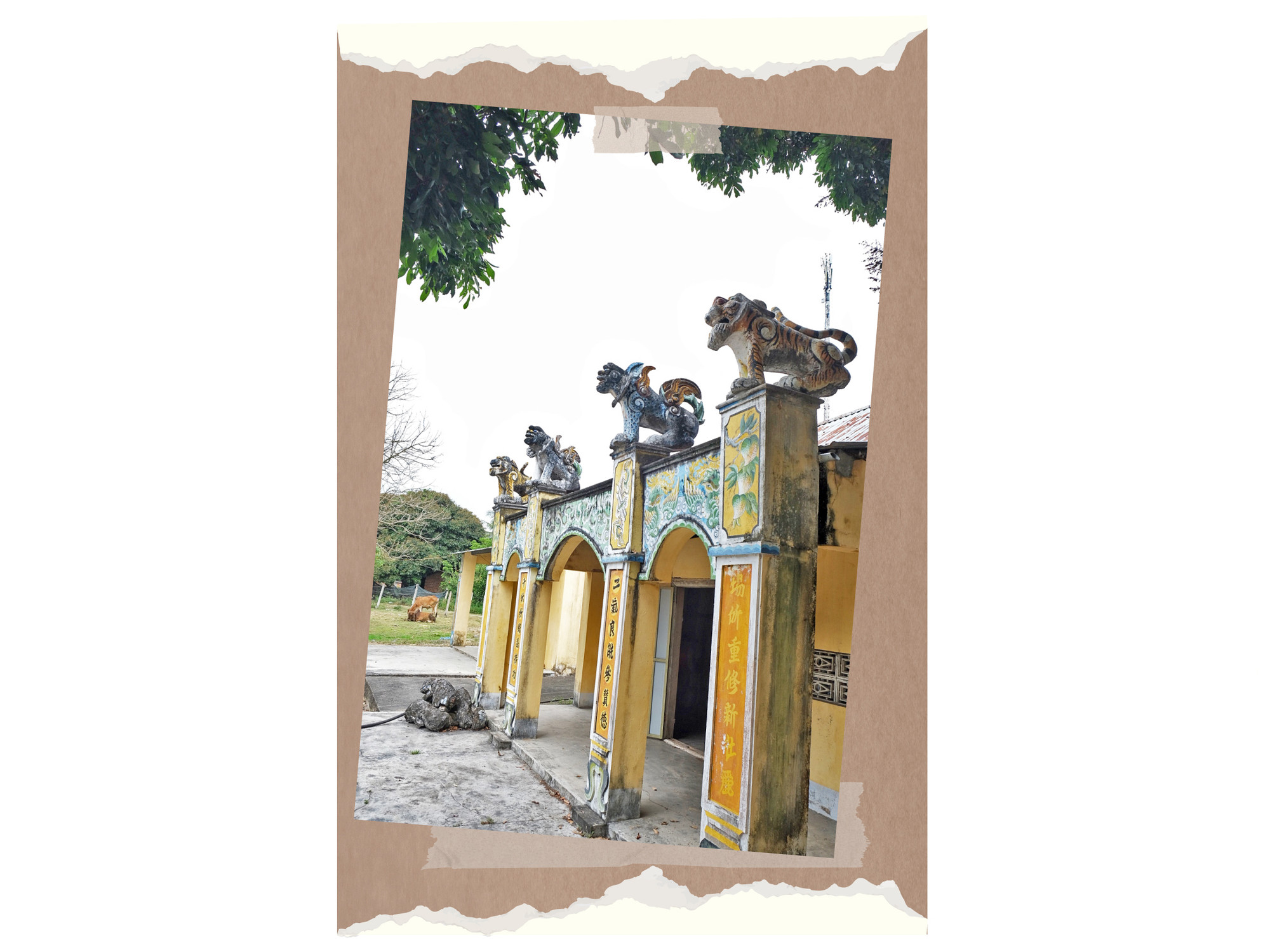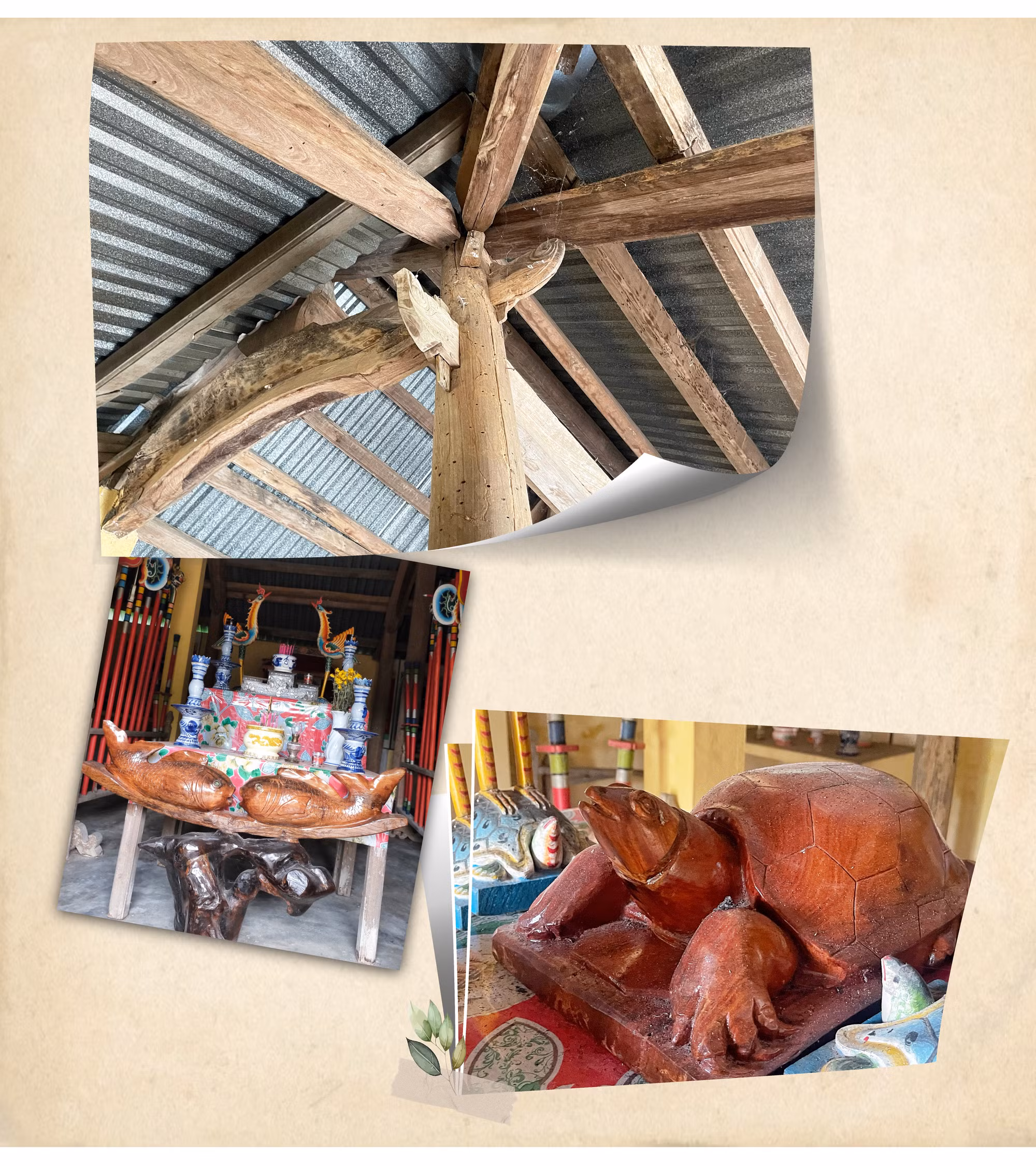 Những linh vật từ đình cũ bị sập dù hư hao vẫn được sắp xếp cẩn thận ở một góc sân đình.
