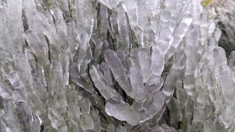 | Cây cối cả vạt rừng bị băng giá phủ trắng xóa. |