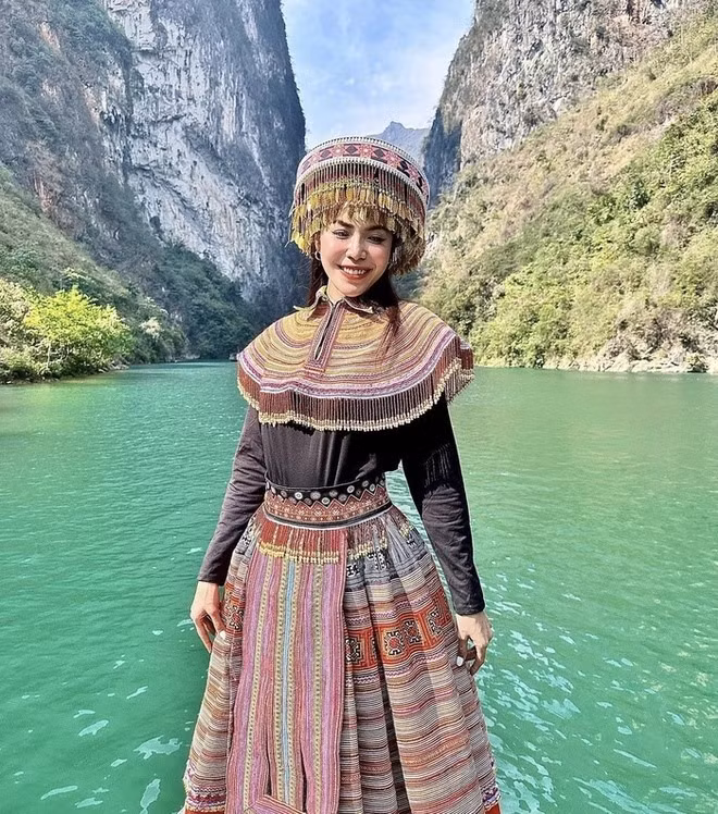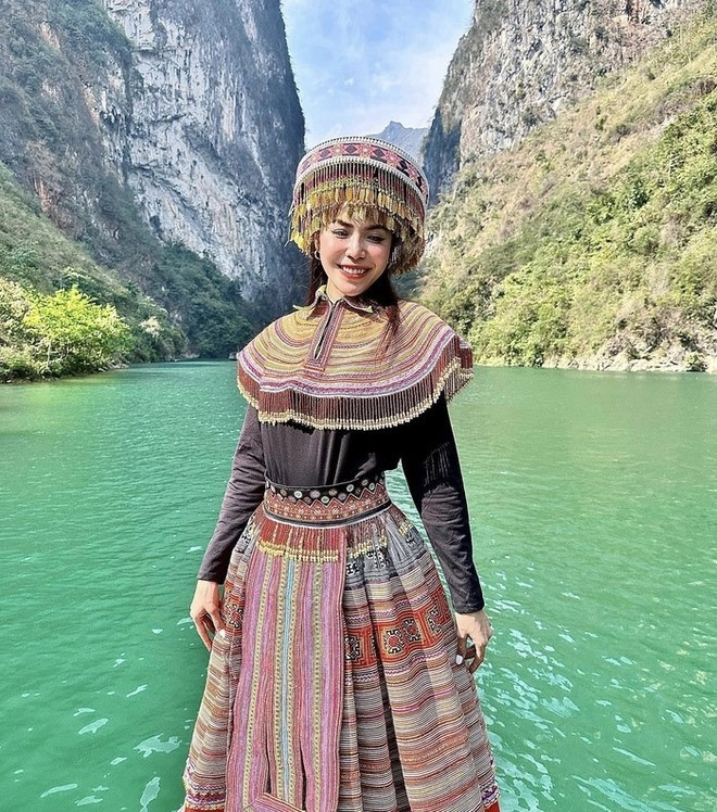 | Minh Tú diện trang phục dân tộc H'mông chụp ảnh trên sông Nho Quế. Ảnh: Facebook Minh Tú |