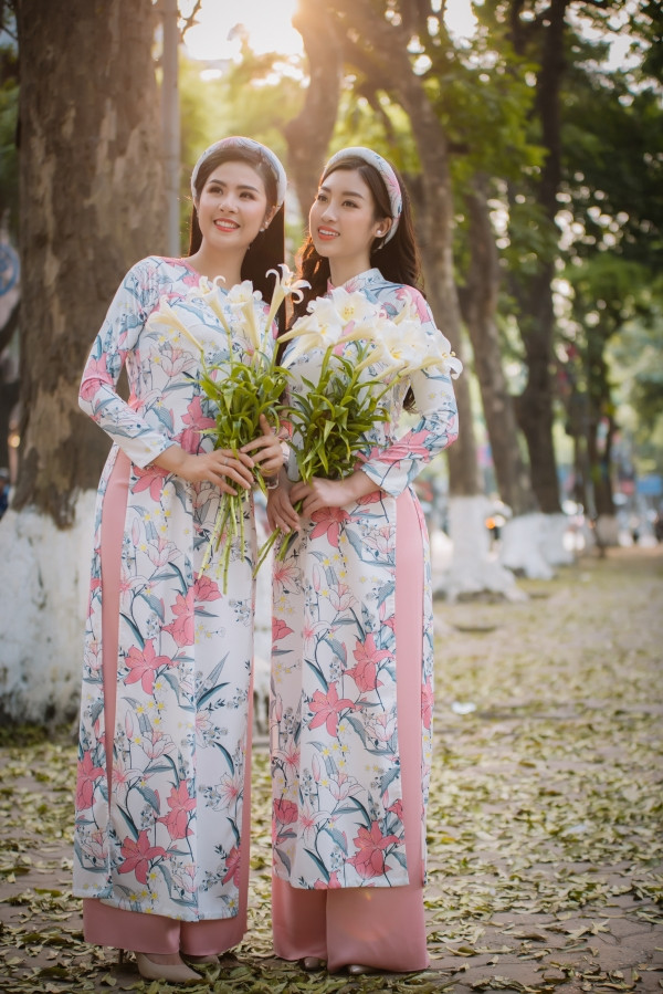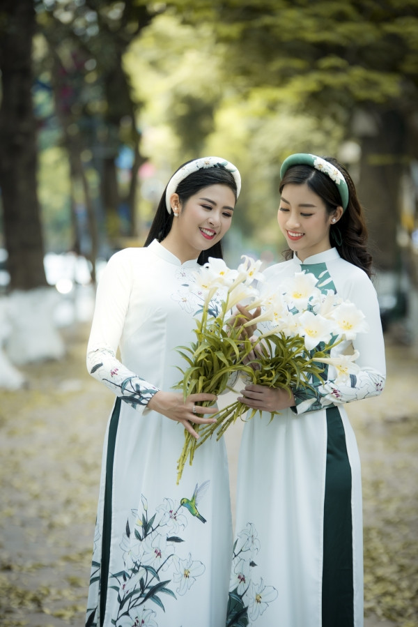 Trước ống kính, Ngọc Hân và Đỗ Mỹ Linh đã diện những thiết kế áo dài hoạ tiết hoa loa kèn dạo bước trên đường phố Hà Nội. Cả hai nàng Hậu đều trang điểm nhẹ nhàng, khoe nụ cười toả nắng khi sóng bước bên nhau.