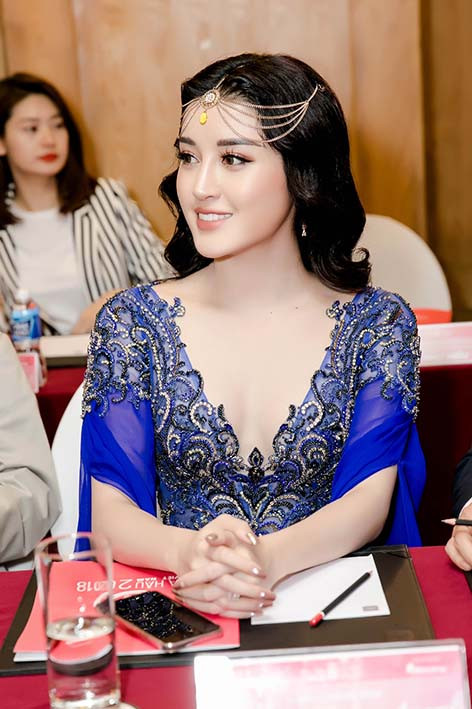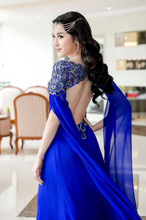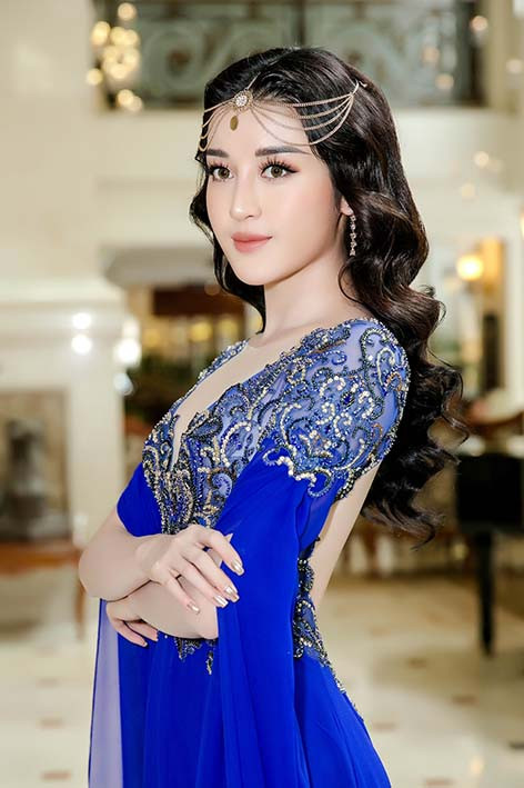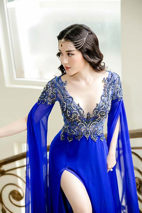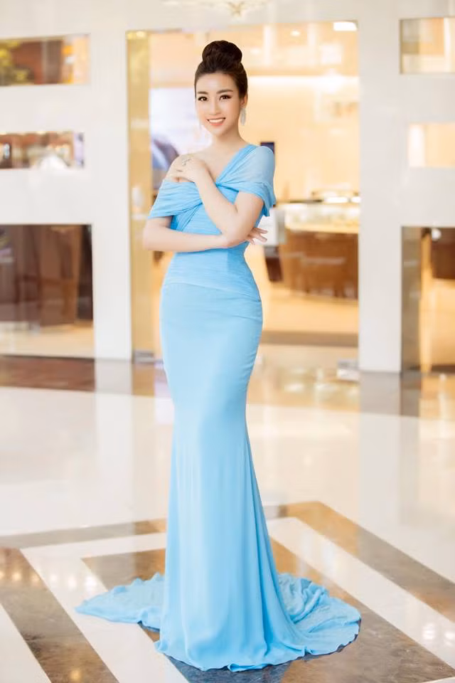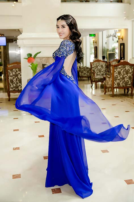 Với chiếc đầm xanh cô-ban bó sát thướt tha, Huyền My lựa chọn phong cách trang điểm tự nhiên, tôn lên gương mặt sắc nét và đầy quyến rũ. Mái tóc được uốn bồng bềnh và được tô điểm gây chú ý bằng món trang sức ấn tượng.